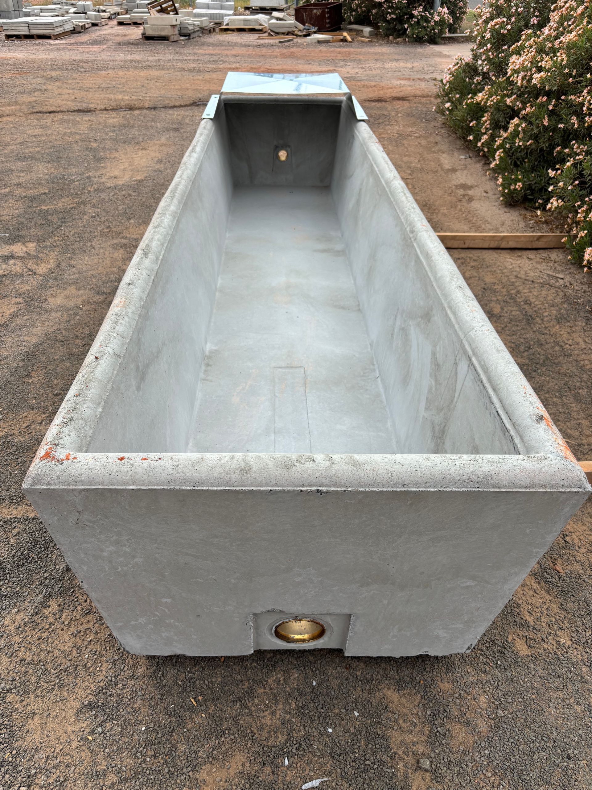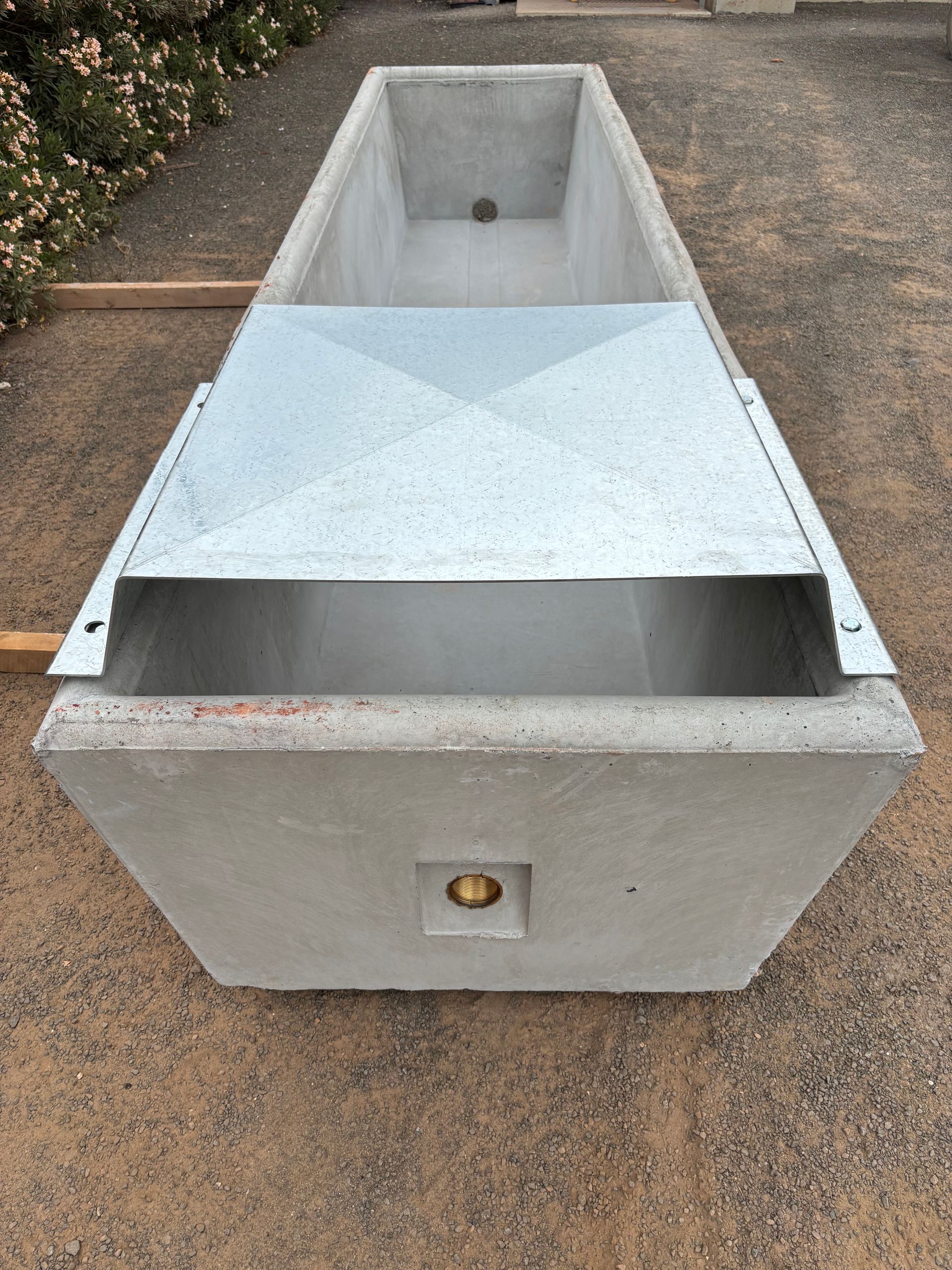 One of our most popular cattle troughs. Higher in the walls than our other stock troughs, this long trough is an an excellent choice for grown cattle with large volume. Recessed inlet square to ground for ease of plumbing.